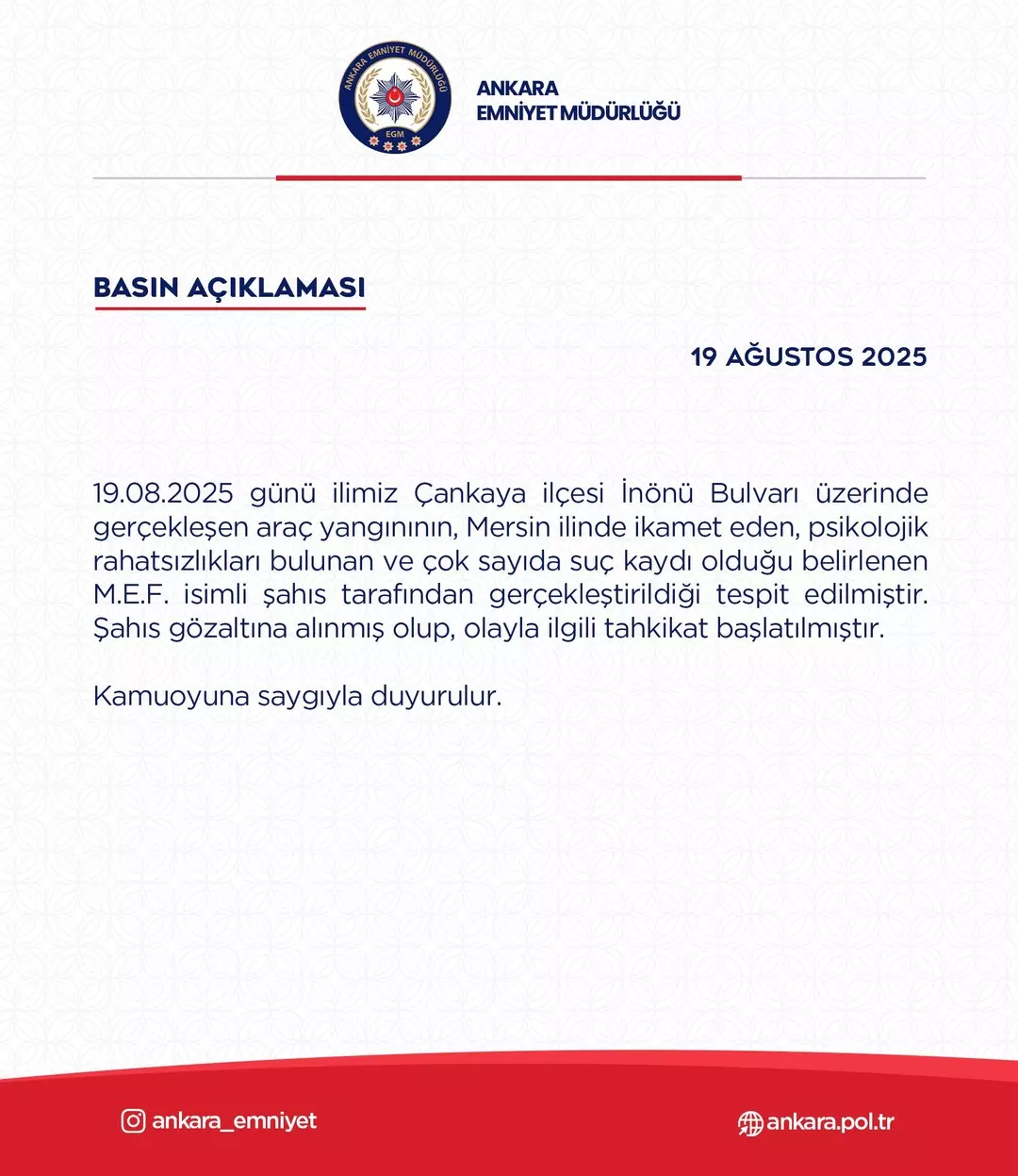 Ankara İl Emniyet Müdürlüğünden yapılan açıklamada “Araç yangını psikolojik rahatsızlığı olan şahıs tarafından gerçekleştirildi” dendi.